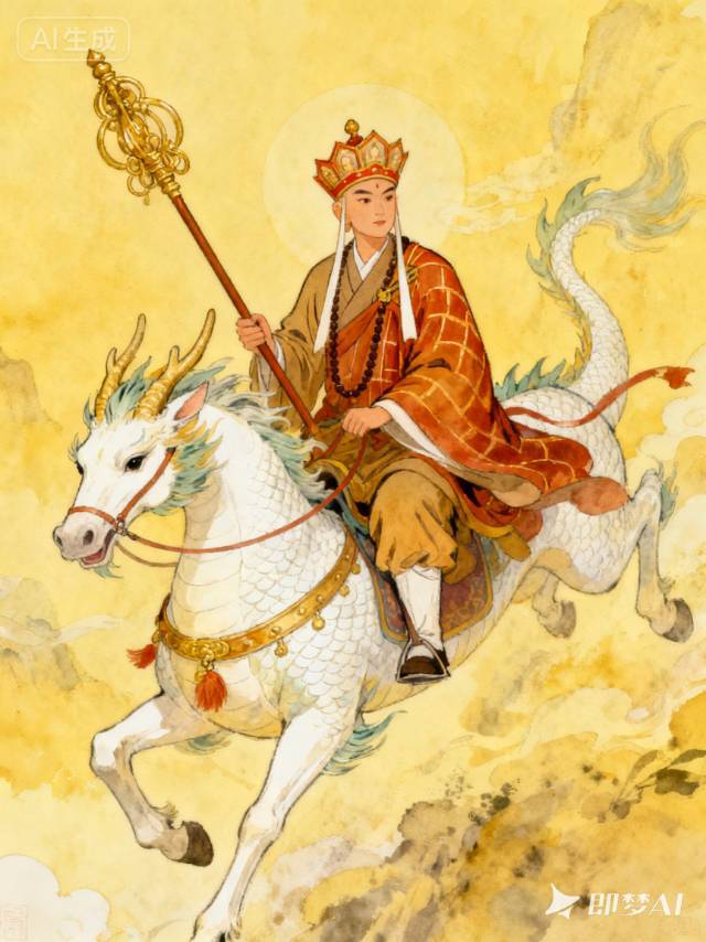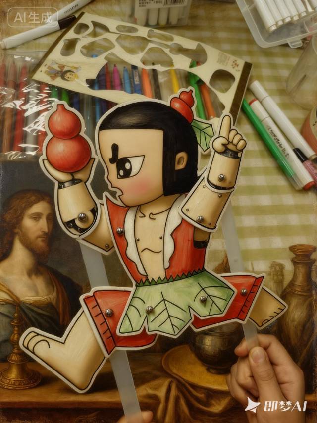 在“关键词AI生图”创作环节,志愿者引导学生围绕经典文化、地域特色等主题组合关键词,例如以“唐僧+白龙马+九环锡杖”为核心元素,触发AI生成创作素材。平台根据输入关键词,自动生成包含水墨、工笔、卡通等至少三种艺术风格的意象图,将抽象的文字转化为具象的视觉参考,有效降低了创作门槛,高效地将创意转化为皮影设计方案。部分学生还基于AI生成图,加入个性化细节,设计出兼具经典韵味与个人风格的皮影形象。
