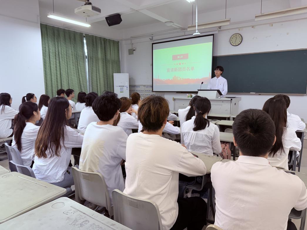 仪式在庄严的国歌声中拉开序幕。激昂旋律凝聚起青年学子的爱国情怀,让新团员深切体悟到入团的庄重使命与荣耀担当。经团支部考察、学院团委审查、校团委批准,30名同学正式成为中国共产主义青年团新成员。苏灵俊同学宣读新团员名单后,院团委组织部工作人员为新团员佩戴团徽、颁发团员证。闪耀的团徽象征着共青团的光荣传统,鲜红的团员证承载着青年一代的责任使命,新团员双手接过“青春信物”,眼神坚定而自豪。