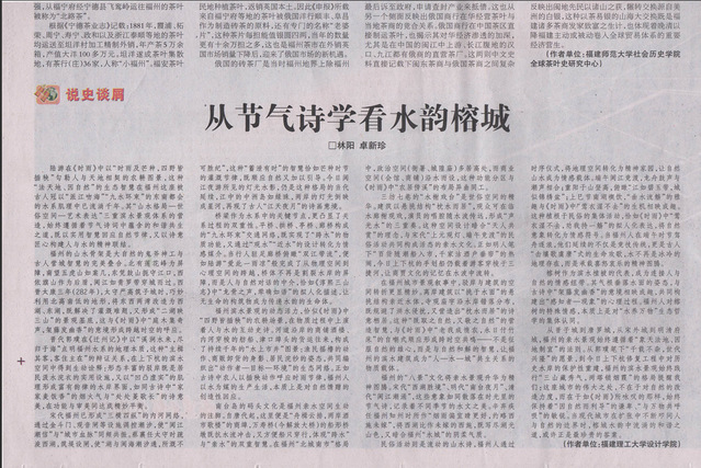 福州城市在历史发展进程中尊重自然规律和天然条件,在山水城市的定位和规范中,体现着中国人的山水人文观。近期,学院教师林阳副教授等两位老师合作在结合中国传统文化和节气诗学的基础上,通过“派江吻海”“九水环束”的福州城市水文肌理,研究分析当代城市发展中人与自然的和谐之道,并通过进一步结合环境设计和诗学,在福建日报理论版上发表文章《从节气诗学看水韵榕城》。