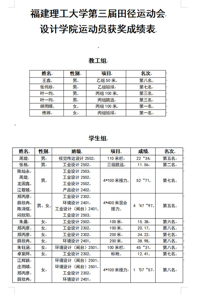 在福建理工大学第三届田径运动会中,设计学院的运动员们表现亮眼,学生组、教工组均斩获了多个项目的奖项,从短跑、跳远到接力赛、铅球等项目,都有我院选手的获奖身影,整体获奖数量颇丰!