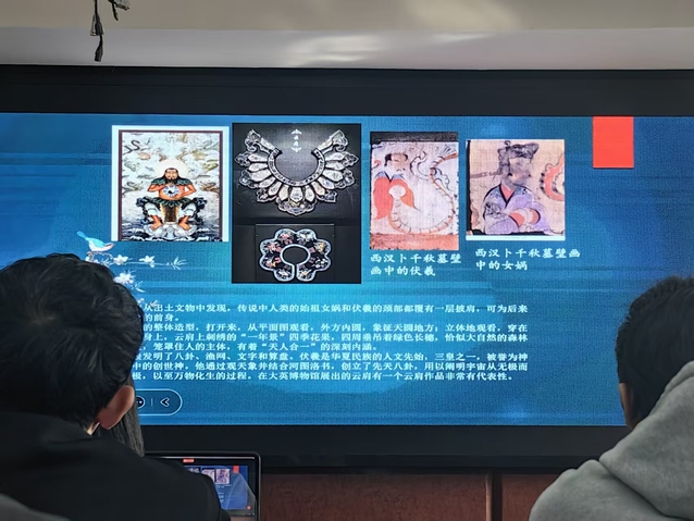讲座伊始,李老师系统梳理了云肩的历史溯源与发展脉络,解析其承载的时代文化特征与社会功能变迁。为进一步夯实云肩的历史渊源实证,李老师结合视频、图像资料与传世文献进行学理延伸,伏羲、女娲形象中颈部的披肩式装饰已具备云肩的早期形制特征,其 “外方内圆” 的经典造型与伏羲和女娲手持规矩所象征的 “天圆地方” 宇宙观形成呼应,而云肩片的刺绣图案及垂坠吊穗,则具象化呈现了 “天人合一” 的文化意蕴。