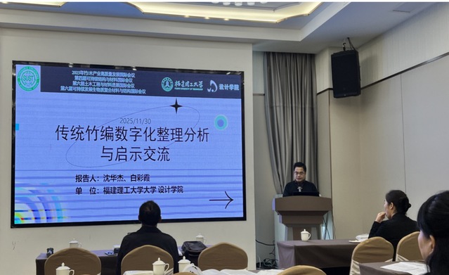 学院沈华杰副教授带领设计学2024级与2025级学生代表参与本次系列会议,深入投身于可持续材料、竹木产业高质量发展等领域的国际学术对话。其中,沈华杰副教授于11月30日在分会场作了题为《传统竹编数字化整理分析与启示交流》的专题报告。该报告紧扣传统工艺传承与数字化转型的时代需求,系统阐述了传统竹编技艺的数字化整理方法,并深入探讨了数字化技术在竹编纹样保存、技艺传承与创新应用中的实践路径,为非遗技艺的当代活化与竹木产业升级提供了兼具理论深度与实践价值的新思路,引起与会专家的广泛关注与积极讨论。