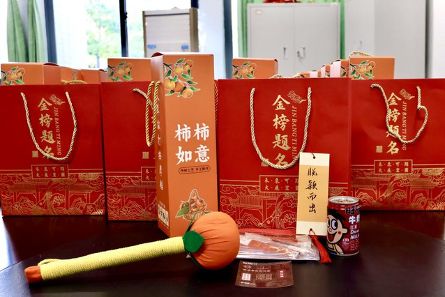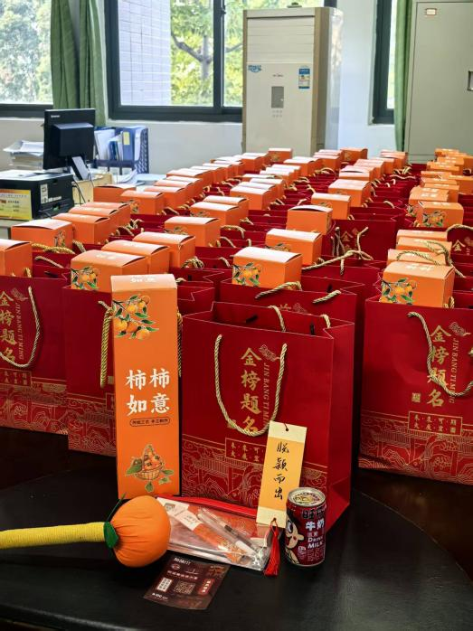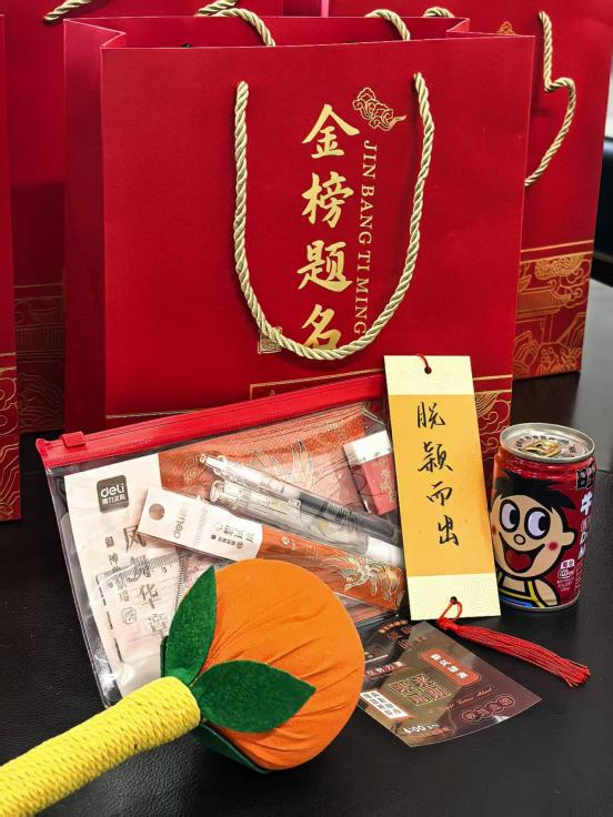 考试专用笔、尺规套装配齐,助力考场发挥稳定,手写书签满载祝福,“金榜题名”“前程似锦”的寄语跃然纸上,藏着学院满满的期许,“大橘大利”艾草锤敲走疲惫,也捎来好彩头,一罐红旺仔亮眼吸睛,盼大家状态拉满,下笔有神。