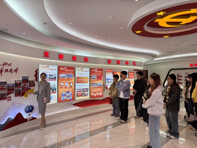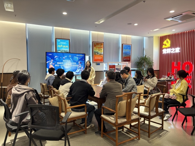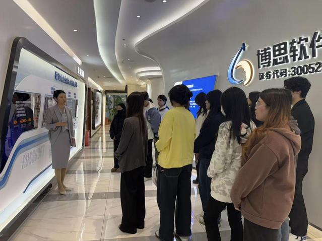在博思软件集团企管中心党群工作部副总经理程鹏华的带领下,师生一行先后参观集团党群活动中心、集团展厅,实地感知企业党建文化的建设成果,以及数字产品设计创新的产业落地路径,在实景观摩中,具象理解 “党建引领产业发展” 的实践逻辑,也对设计专业在数字经济领域的应用价值形成更清晰的认知。