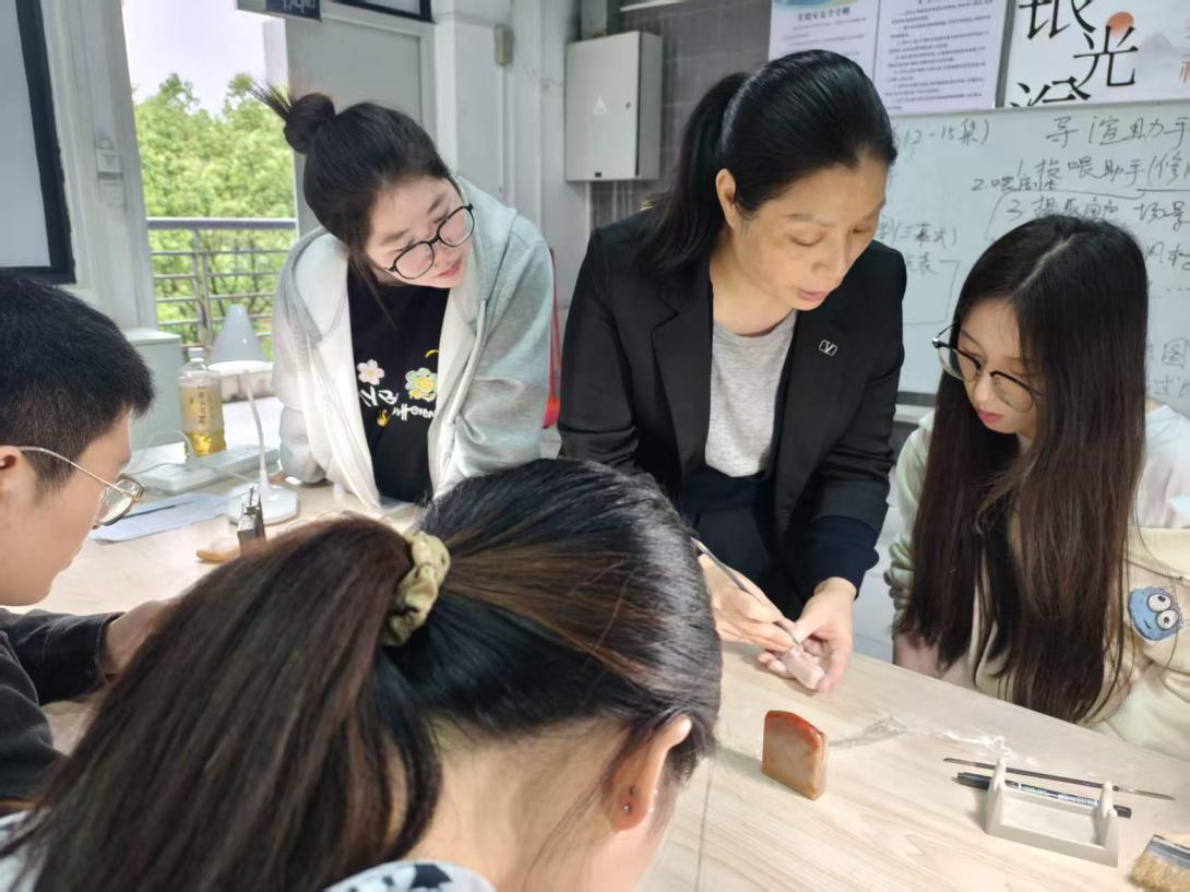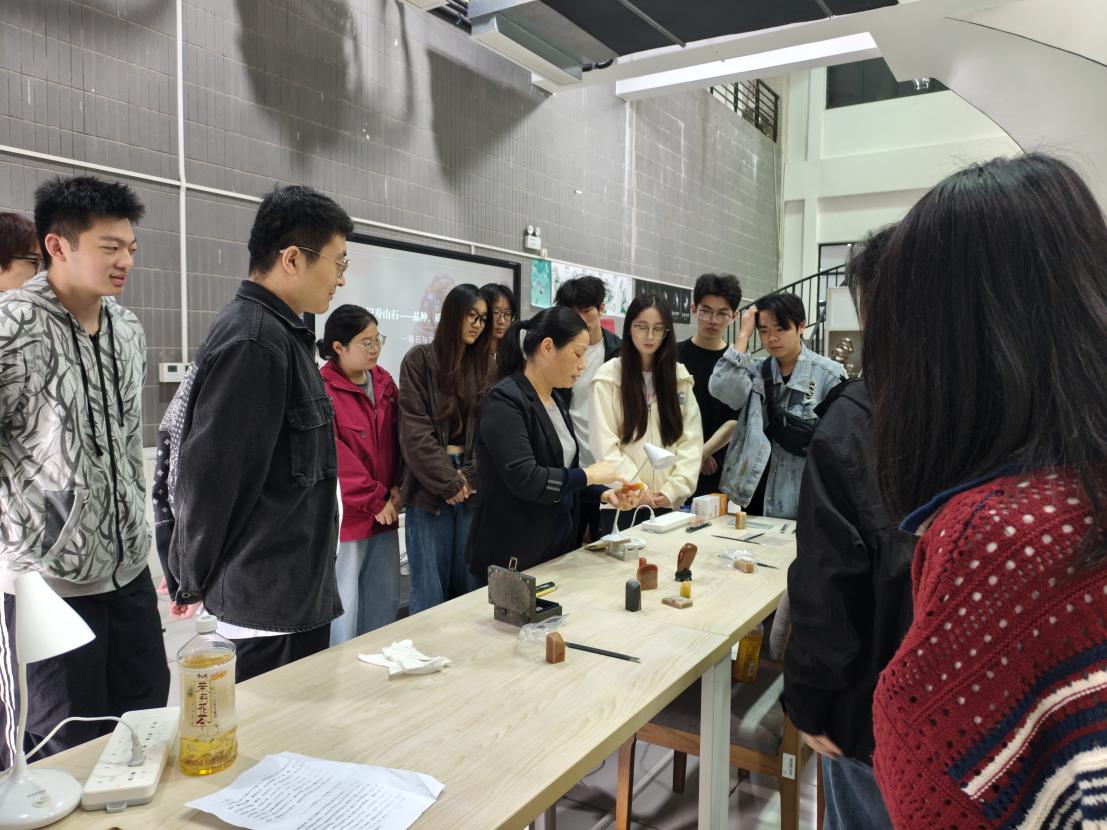 讲座中,张华俊大师理论结合实践不仅介绍了寿山石的历史文化与品种特征,系统讲解了寿山石的三大分类,她还深入解析了寿山石质地的“六德”,并阐释了“相石取巧、因材施艺”的雕刻理念。现场实操环节,同学们兴趣浓厚,纷纷构思创作。张华俊大师演示了寿山石雕的不同工艺,寿山石雕技法丰富,涵盖圆雕、浮雕、薄意雕、镂空雕、链雕、钮雕及篆刻等。每一种技法都要与石材质地完美契合,实现“天人合一”的艺术境界。张大师指导学生用不同工具体验相石、打坯、凿坯、修光、磨光的基本流程,近距离体验寿山石雕从相石、构图到分层刻画的创作流程与核心技法,直观感受雕刻过程中“精、简、意、趣”的艺术追求。